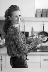 Portrait of happy young housewife holding baked pumpkin