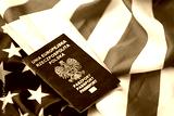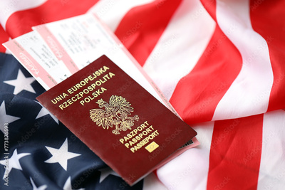 Poland passport with airline tickets on American US flag close up. Tourism and travel concept