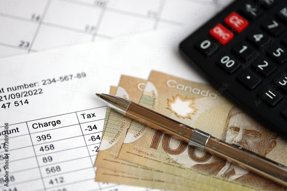 Many calculation results in schedules lies on table with canadian money bills, calculator and pen close up. Taxation and annual accountant paperwork in Canada