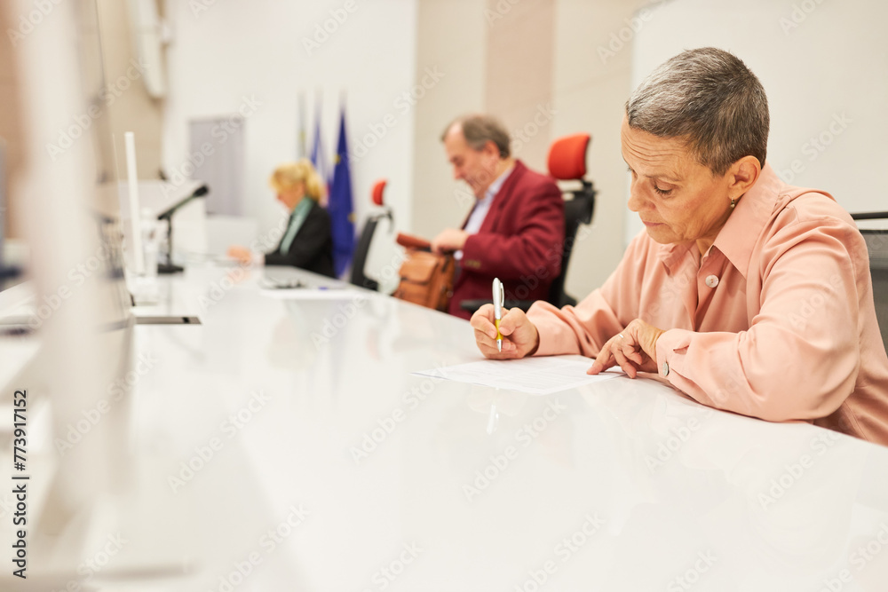 Speaker writing in document at table in convention center