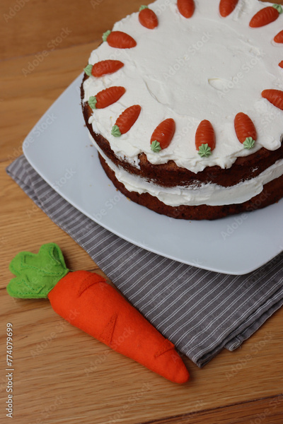 Homemade carrot cake with mascarpone cream cheese icing, mini marzipan carrot decorations and felt carrot