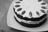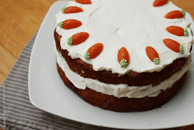 Homemade carrot cake with mascarpone cream cheese icing and mini marzipan carrot decorations