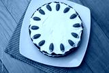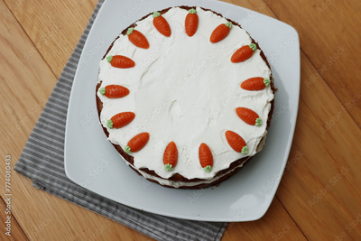 Top view of carrot cake with mascarpone cream cheese icing and handmade mini marzipan carrot decorations