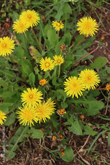 Dandelion plant in bloom with many yellow flowers and blossoms. Taraxacum officinalis