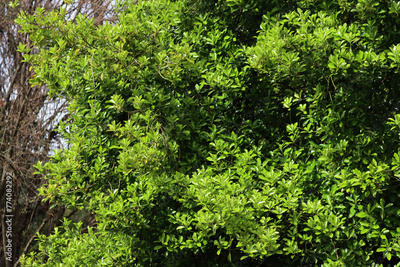 Euonymus japonica bush with yellow and green leaves. Evergreen plant called Japanese spindle tree