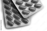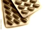 Pharmaceutical medicine capsules isolated on white background. Orange pills in blister packaging