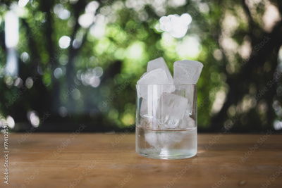 Glass of ice and water on wood table, homemade ice cubes
