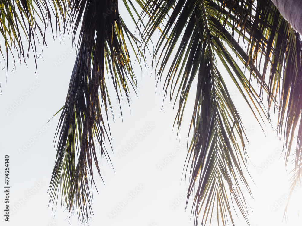 Bright palm leaves against the background of the morning sun. Sunny, clear day. Close-up, outdoor. Macro photography. Vacation and travel concept