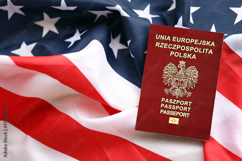 Poland passport on United States national flag background close up. Tourism and diplomacy concept