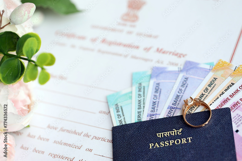 Indian Certificate of registration of marriage blank document and wedding ring with rupiah money on table close up