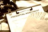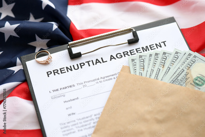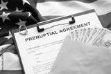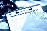 Prenuptial agreement and wedding ring on table. Premarital paperwork process in USA close up