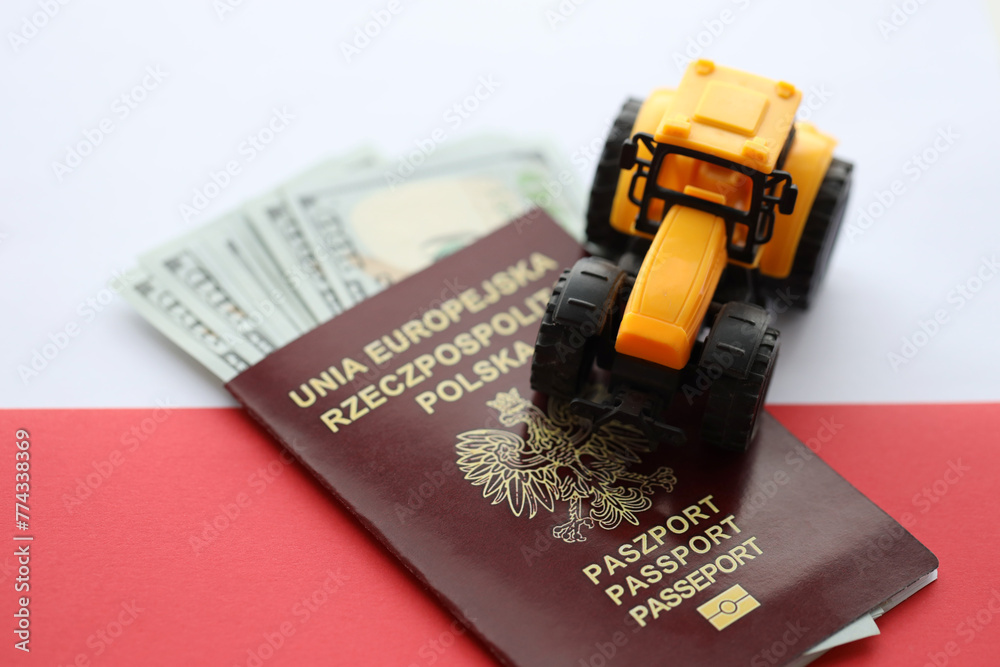 Red polish passport and yellow tractor on US money and smooth red and white flag of Poland close up