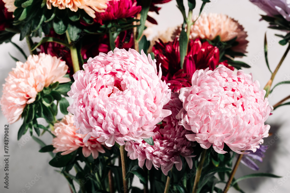 Pink and red asters on a white background. Bouquet of bright autumn flowers
