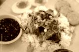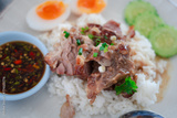 Slice of braised pork placed on hot steamed rice served with boiled egg and sliced cucumber