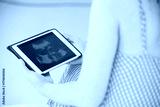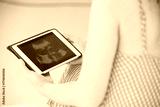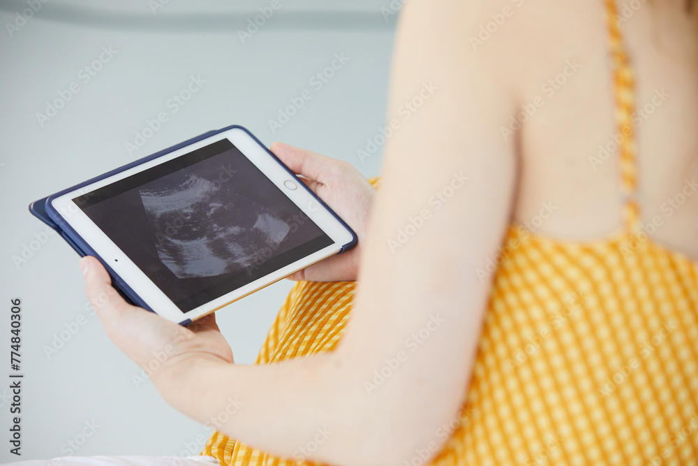 pregnant woman looking x-ray photo on tablet