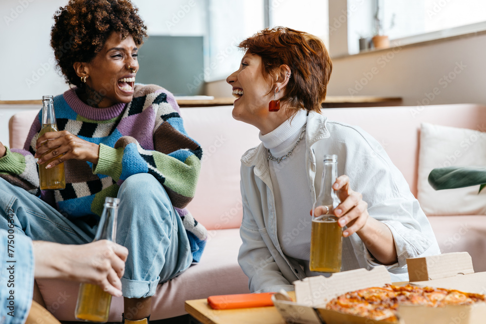 Colleagues relaxing in a modern co-working space with drinks