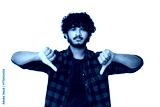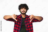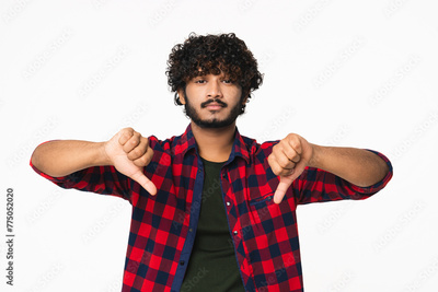 Sad young Hindi man showing thumbs down isolated over white background. Indian boy expressing dissatisfaction, negative attitude, dislike concept
