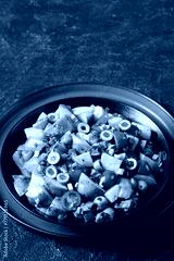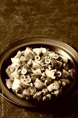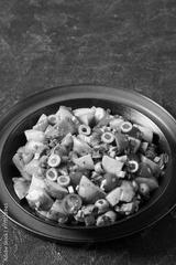 spanish potato salad with chorizo in black bowl