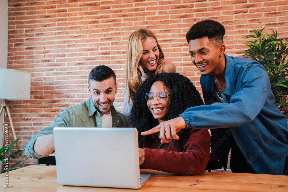 Group of young adult friends having fun using a laptop sharing on the social media. Happy and smling multiracial people browsing online with a computer. Couples watching videos with a notebook at home