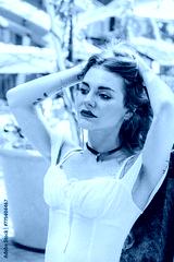Beautiful blonde Italian girl, outdoors in a square in Milan