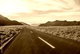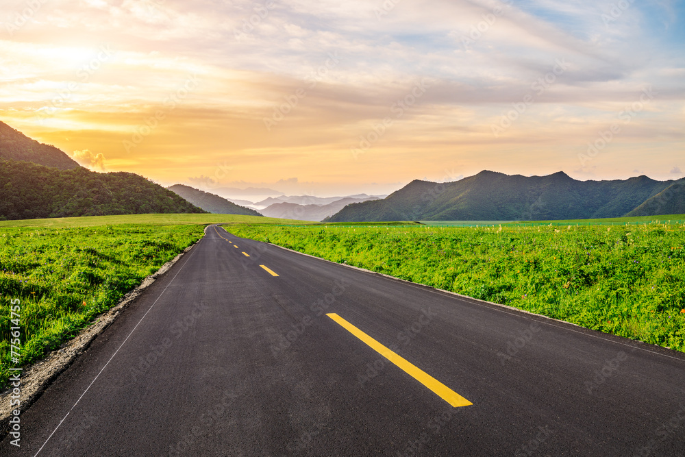 Asphalt highway road and green meadow with mountain nature landscape at sunset