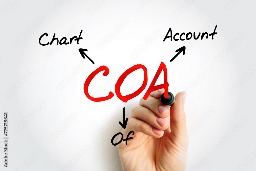 COA Chart of Account - index of all the financial accounts in the general ledger of a company, acronym text concept background
