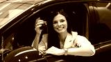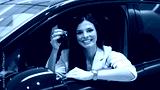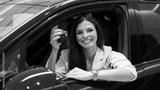 Happy young woman sitting in the brand new car at the salon and holding the car keys