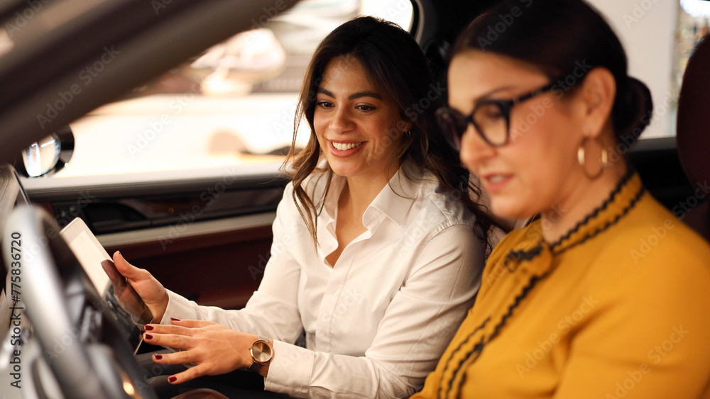 Beautiful, young car saleswoman working at the at the car salon and selling the car to a mature woman