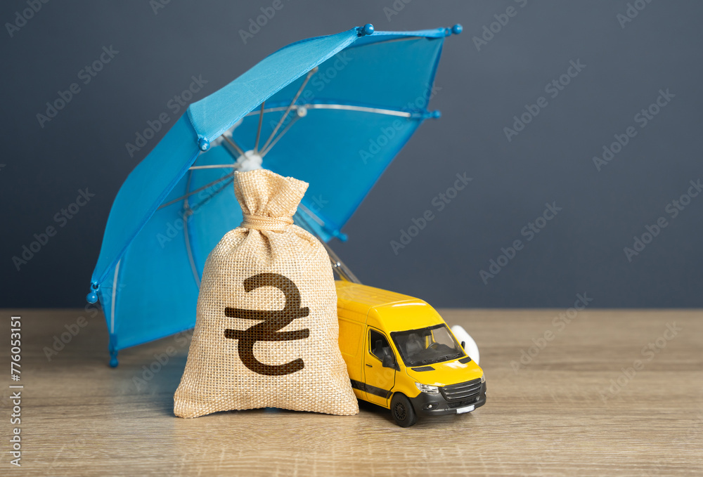 Yellow delivery van and ukrainian hryvnia money bag under an blue umbrella. Cargo and parcel insurance. Logistics security. Warranty obligations. Protection in conditions of military aggression