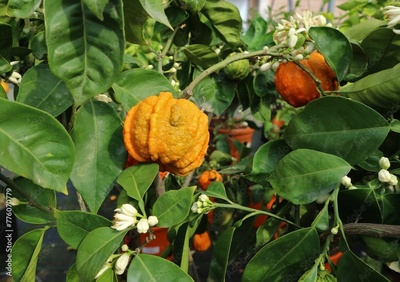 Bitter orange, or Citrus Aurantium fruit, on plant ina greenhouse. It is used for perfume, essential oil and herbal medicine