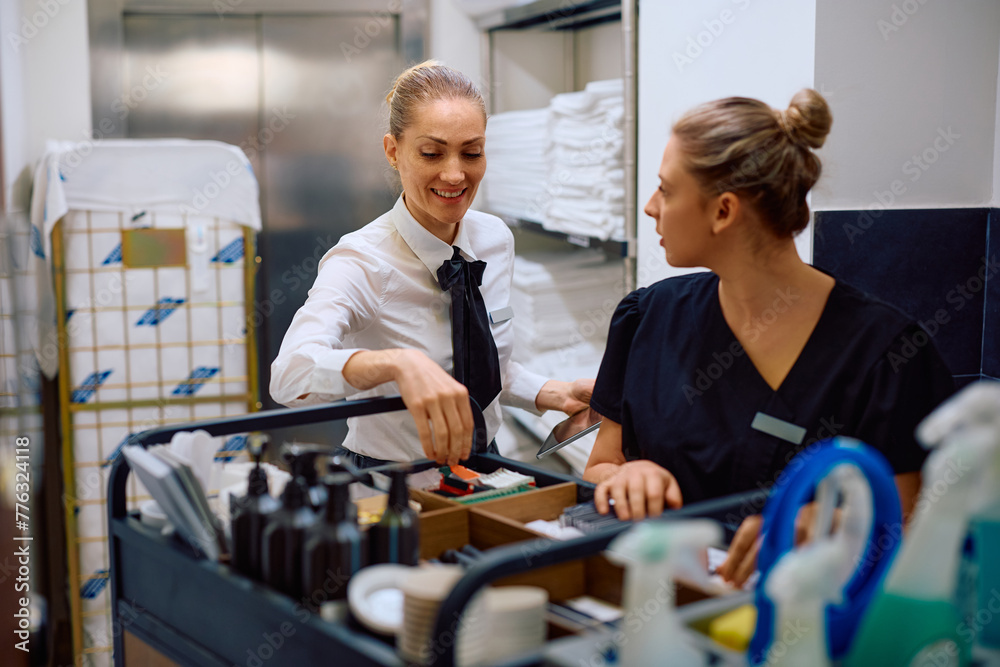 Happy executive housekeeper and young maid working in hotel.