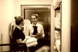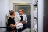 Happy housekeeping supervisor and chambermaid communicating in hotel laundry room.