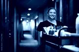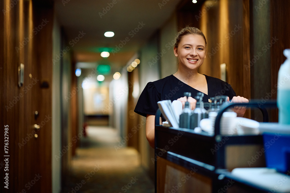 Happy housekeeper with stocked chambermaid's trolley in hotel looking at camera.