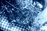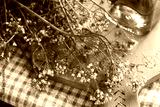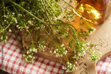Closeup of fresh blooming shepherd's purse plant on a table, with a bottle of tincture in the backbground