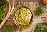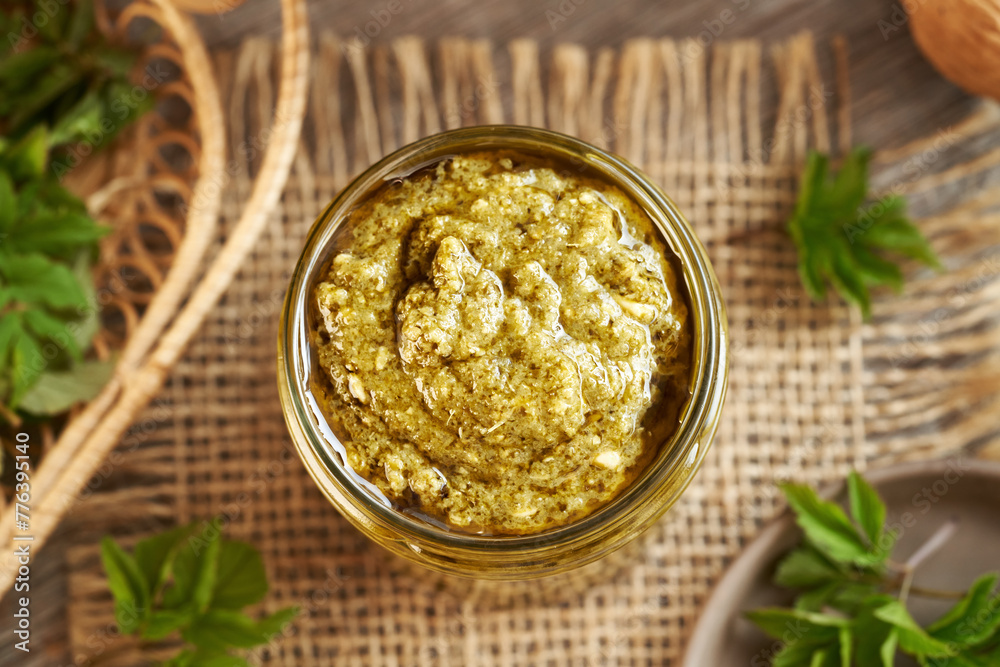 Homemade green pesto made of young goutweed leaves - a wild edible plant growing in early spring