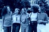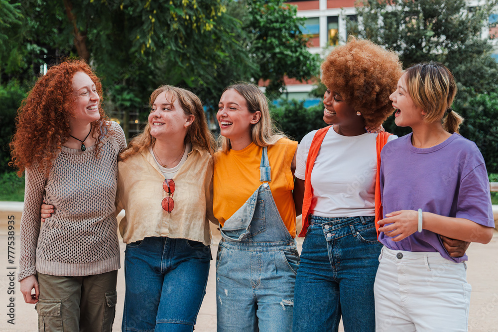 Group of joyful young women, laughing and enjoying a weekend trip. Real cool girls walking embracing with a smile. Happy female friends having fun together outside. Generation of unity and vitality
