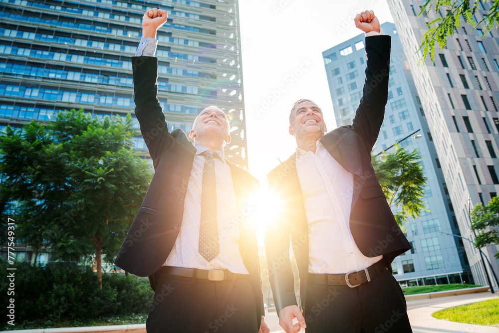 Two succesful mature business men celebrating a work goal. Victory of two businessmen with aspirations. Executive males accomplishment. Ecstatic mid adult job colleagues winning with satisfaction