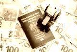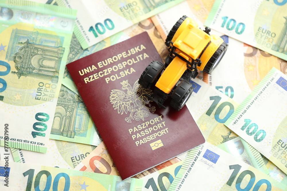 Red polish passport and yellow tractor on euro money bills close up