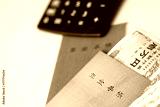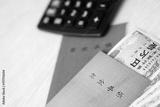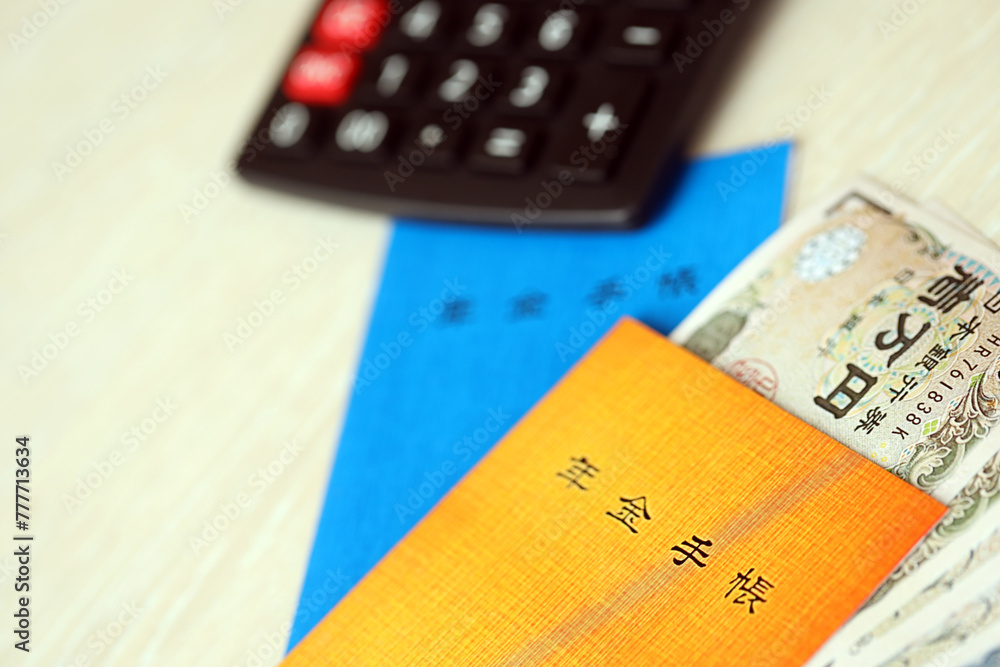 Japanese pension insurance booklets on table with yen money bills and calculator on table close up