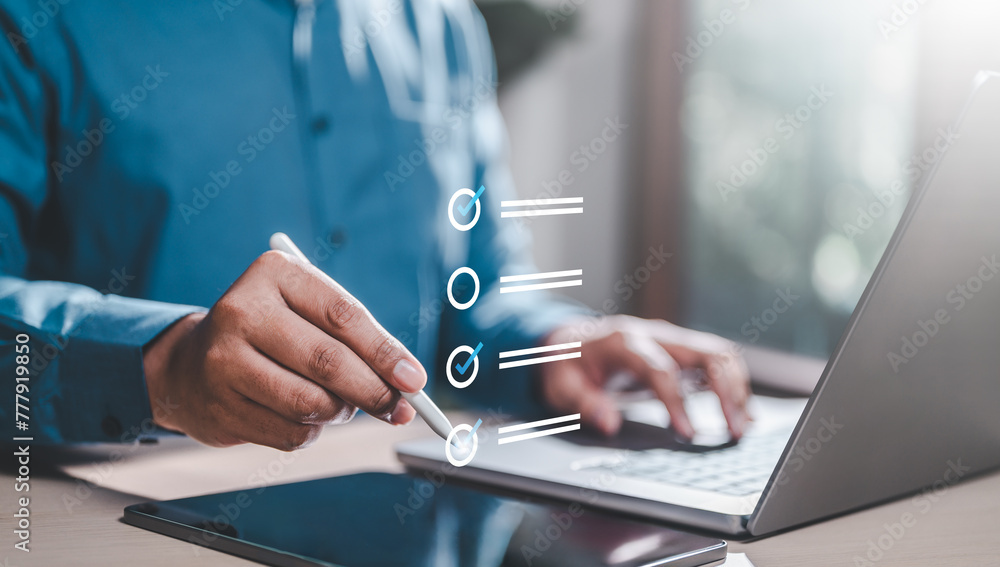 checklist, list, check, graph, report, strategy, information, social, management, analysis. A man is using a laptop with a check mark on it. and he is checking something on the laptop.