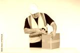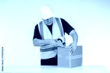 Man in Safety Gear Securely Taping a Box, Focused on Packaging in a Bright Work Environment