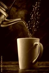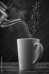A Cup of Coffee Pouring Hot Water and Coffee Beans