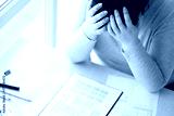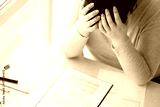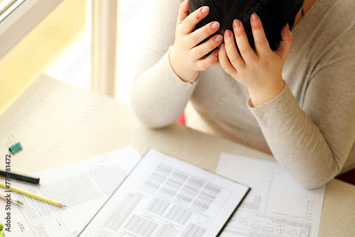 Sad female student testing in exercise and fill exam paper sheet with pencil at school test room, education concept