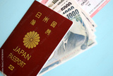 Japan passport with money and airline tickets on blue background close up. Tourism and travel concept