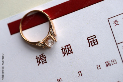 Japanese marriage registration blank document and wedding proposition ring on table close up