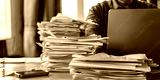 At the desk working person on laptop computer with a pile of documents on table in office. Overwork and excess responsibilities at work