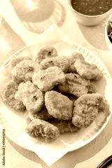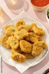 Delicious golden chicken nuggets on a plate on the table. Fast food, menu.