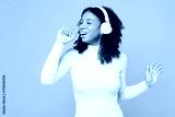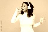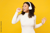 Little kid teen girl of African American ethnicity wear white casual clothes listen music in headphones sing song in microphone isolated on plain yellow background studio. Childhood lifestyle concept.