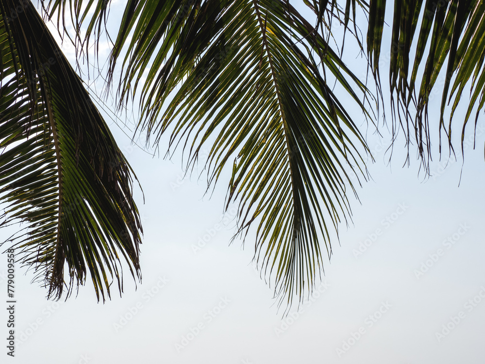 Bright palm leaves against the background of a clear morning sky. Sunny day. Close-up, outdoor. Macro photography. Vacation and travel concept