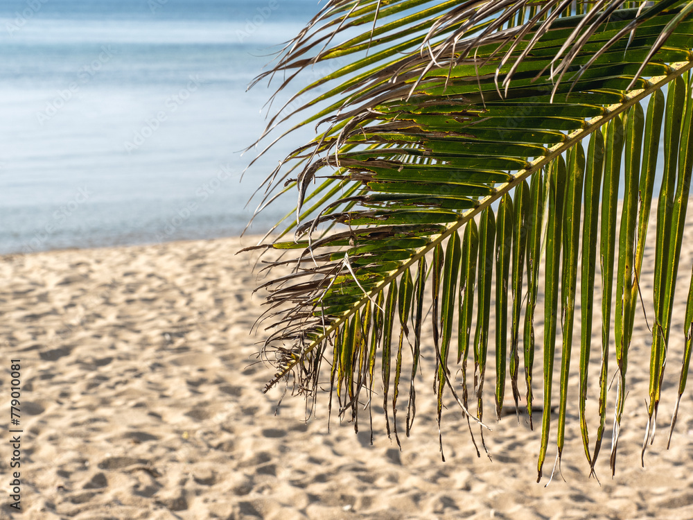 Palm tree and stunning white sandy beach. Beautiful landmark of Thailand. Clear day, warm sunlight. No people, outdoors. Concept of leisure and travel